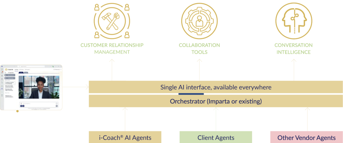 - An orchestrator (either Imparta’s or an existing enterprise AI orchestrator) to ensure all agents work together, sharing context and providing consistent, adaptive support wherever the user is working, who can connect to: