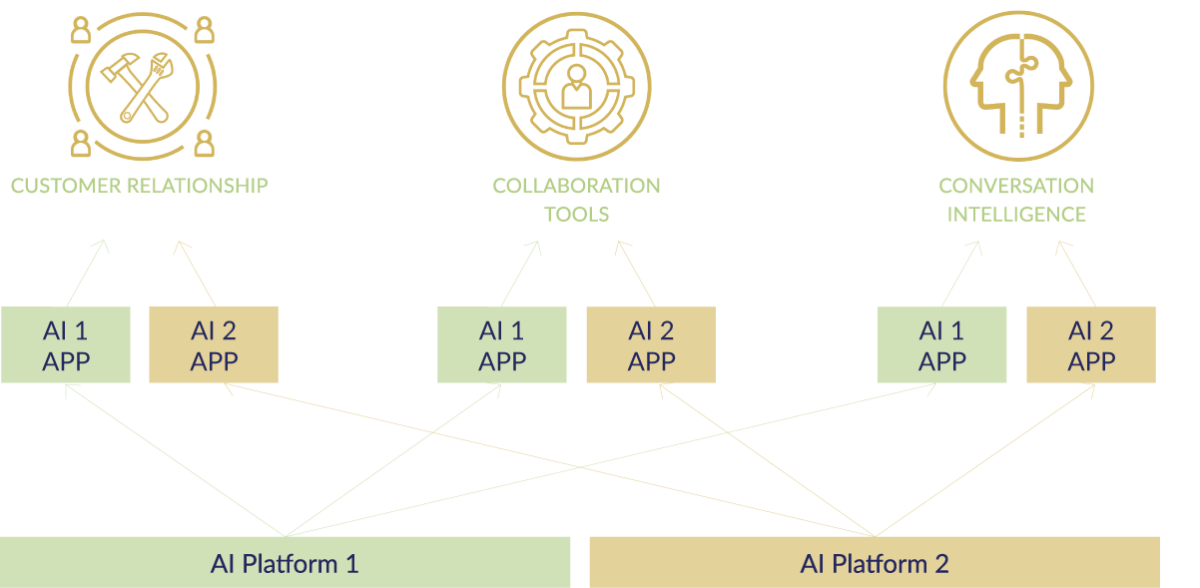Individual AI apps are embedded separately into different systems in the tech stack (e.g. Salesforce, Teams, Gong).